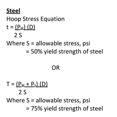 Notice the two different equations used to calculate thickness design. Allowing the stress to escalate to 75 percent of yield strength lowers the steel pipe's safety factor to 1.33 when including surge, compared to the 2.0 safety factor used in the DI pipe design. The difference in percentages to yield affect the thickness design of the pipe.