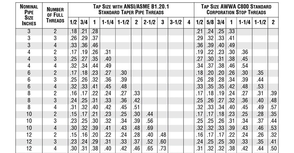 McWane Ductile offers a chart in their Pipe Economy for choosing the proper metal thickness of pipe and thread count needed on the service tap to meet 500 psi requirements. See this Iron Strong Blog to find out What is the Maximum Direct Tapping Size for DI Pipe by my colleague Jeff Houser.