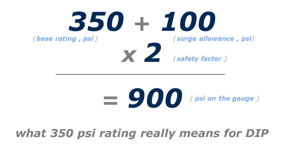 - Pressure Rating: represents the minimum valued capacity of the barrel, and in specific terms, equates to the pressure class of the barrel plus 100-psi of surge allowance, with that sum then multiplied by a safety factor of 2.0. This value, however, is NOT the ultimate pressure containment value for that DI pipe. All Thickness Class DI pipe have a pressure rating of 350-psi and, therefore, sufficient for containment of at least 900-psi water, joint restraint dependent. Manufacturing considerations that add additional metal to the required minimal pipe wall are the basis for pressure containment capabilities above the nominal wall pressure rating.