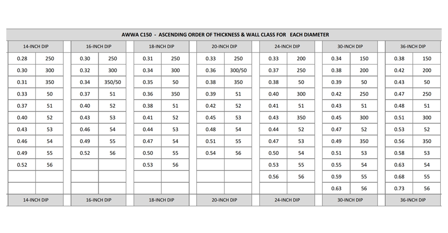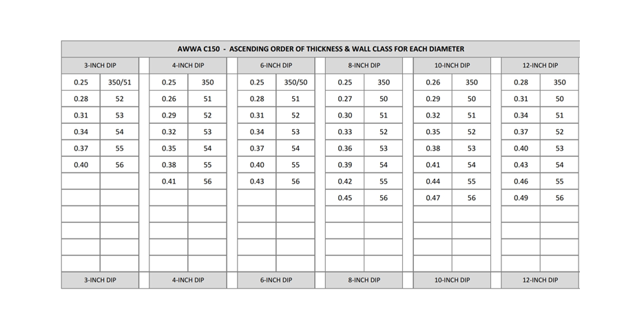 Modern Ductile iron thickness classes, 50 thru 56, have been around since the mid-'70s. For each single-digit increase in the labeled thickness class, the nominal metal wall thickness requirement for DI pipe diameters of 24-inches and smaller increases by 0.03-inches. Wall thicknesses, resulting from the triad of design calculations outlined in the AWWA C150 standard, could range from 0.25-inches for a 3-inch class 51 pipe to 0.56-inches for a 24-inch class 56 DI pipe.