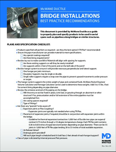 Installing Ductile iron piping on a bridge or similar structure? Download our best practice recommendations for bridge installations to plan your aerial pipeline, choose the right products, and account for any special scenarios.