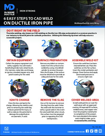 Thermite welding, also known as CAD welding on Ductile Iron pipe and products is a common practice in our industry today. By utilizing this tip sheet it will help you ensure a successful project.