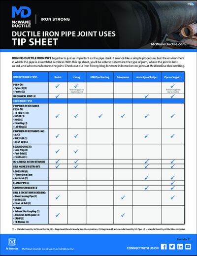 Joining Ductile iron pipe together is just as important as the pipe itself. The environment in which the pipe is assembled is critical. This tip sheet will help you determine the type of joint, where the joint is best suited, and who manufactures the joint.