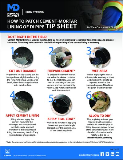 Cement-Mortar Lining is the standard DI pipe lining used to increase flow efficiency and prevent corrosion. In the field, there may be times when patching of the cement lining is necessary. Do it right with this helpful tip sheet.